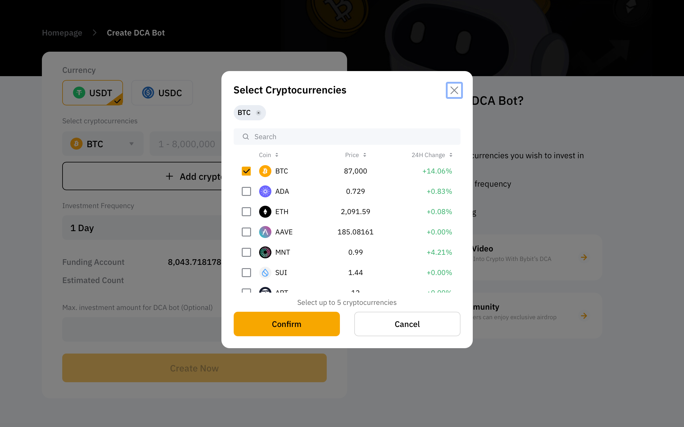 You can select up to five coins for a DCA bot.