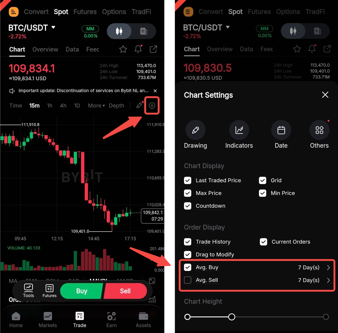When trading on Spot, you can display the average price of your buy and sell orders directly on the trading chart. To enable this, click Display and tick the average price option you'd like to see. You can also select the period over which the average is calculated. Please note that the calculation is based on trades from the current day up to the last day of the selected period.