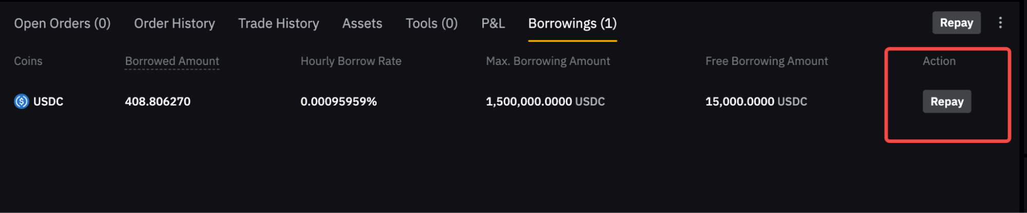 - Manual Borrow allows you to borrow funds manually in advance by clicking the Borrow button.