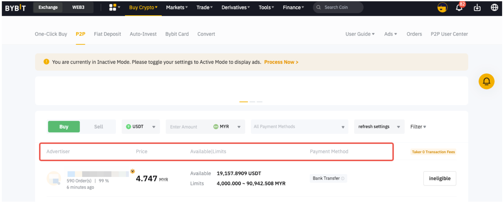 — The Available/Limits column displays the available balance for each advertisement as well as the minimum and maximum transaction limits per order, in fiat terms.