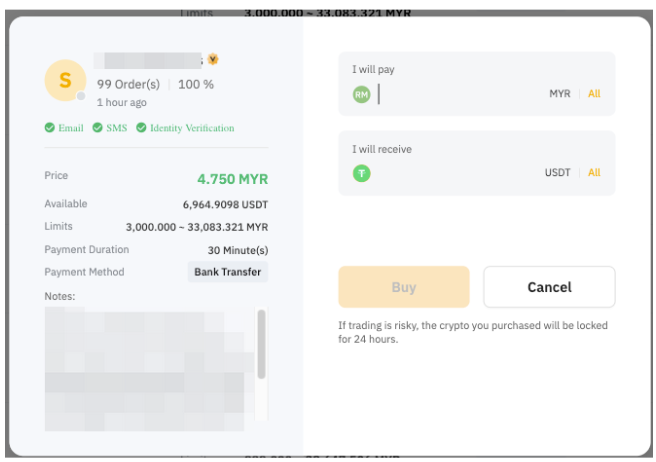 — Failing to transfer the funds to the Seller within the set timer or insufficient balance in your Bybit account will automatically cancel your order.