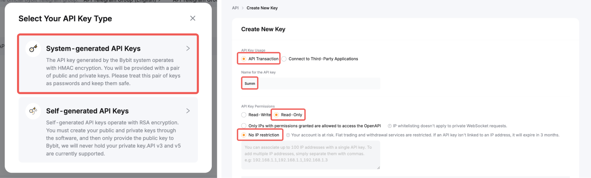 4. API Key Permissions: Read-Only & No IP restrictions