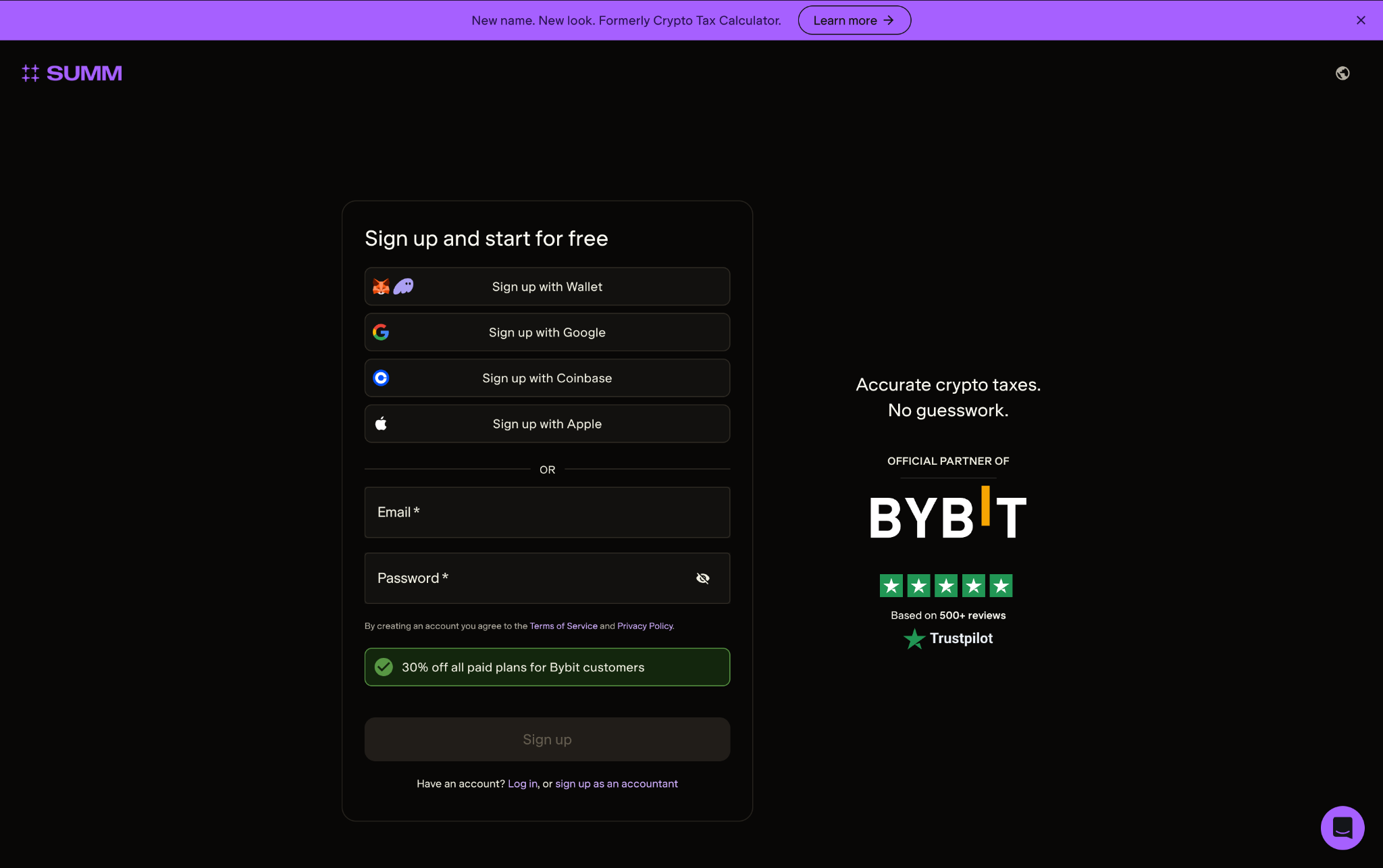To make your life easier, Bybit has been integrated into Summ (formerly Crypto Tax Calculator) so you don’t have to worry about manual calculations. Simply connect your account and your transactions will be automatically imported for you, along with a range of tax reports ready for you to submit. Let’s jump in to how to do your Bybit taxes with Summ.