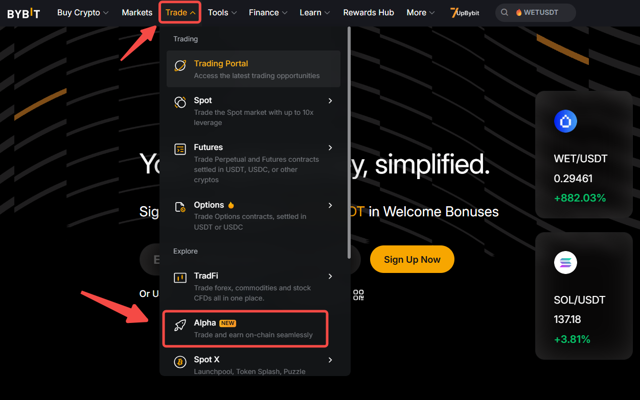 Step 1: Go to Trade in the top navigation bar and click on Alpha.