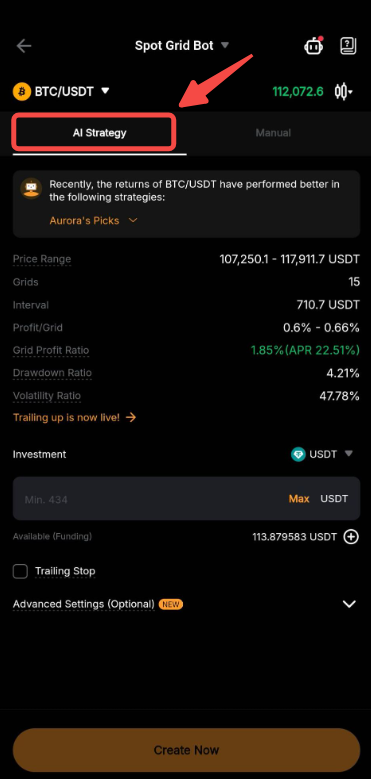 By using AI Strategy, the system will suggest the parameters based on the historical data performance of the Spot trading pair. Alternatively, you can also refer to the suggestion from Aurora’s Picks to create a Spot Grid Bot based on your preferences.