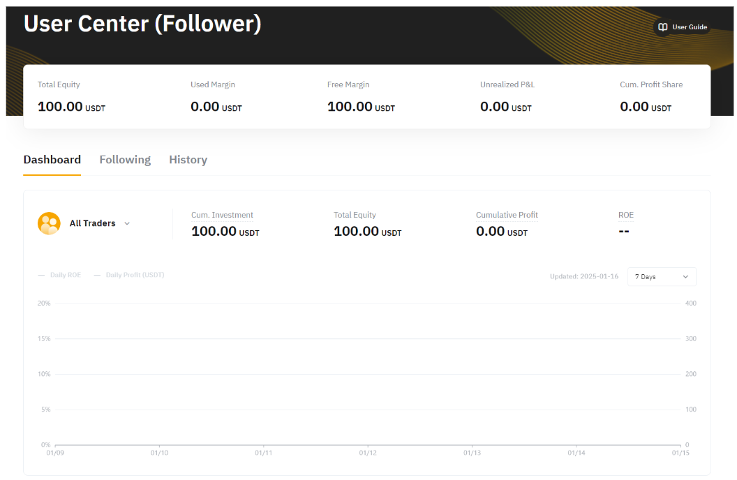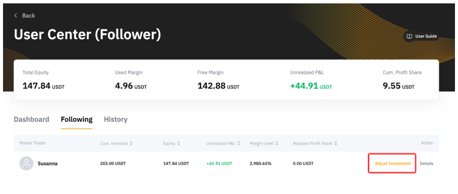 Step 1: Go to User Center (Follower) → Following → Adjust Investment. Then, click on Increase Investment or Reduce Investment. Once submitted, the request to reduce investment cannot be revoked.