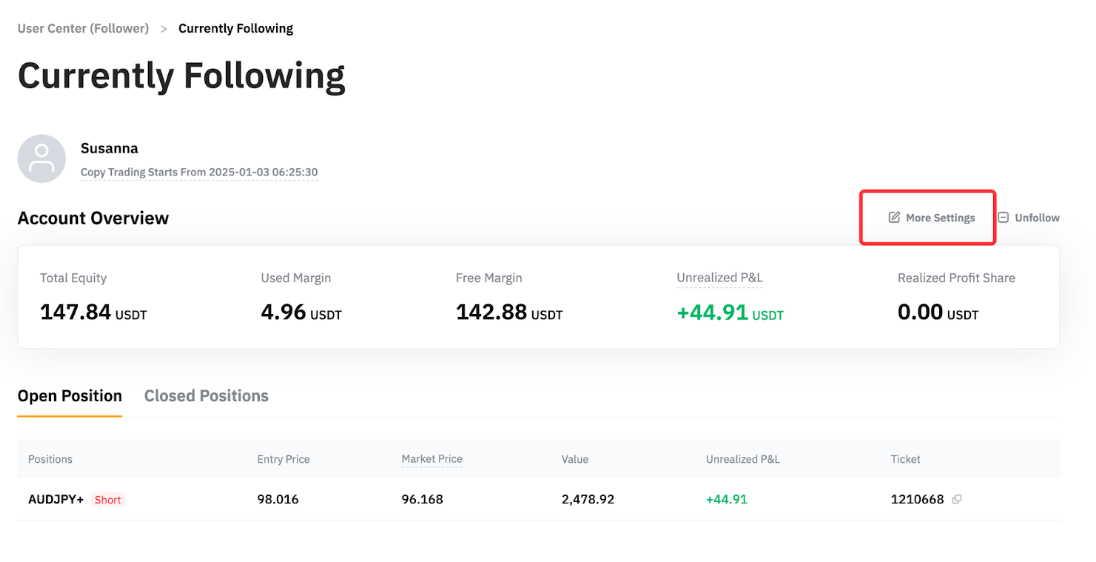 Step 3: Go to the Currently Following page and click on More Settings. You can update the Trailing Stop, Take-Profit and Stop-Loss amounts, and click on Configure Settings.