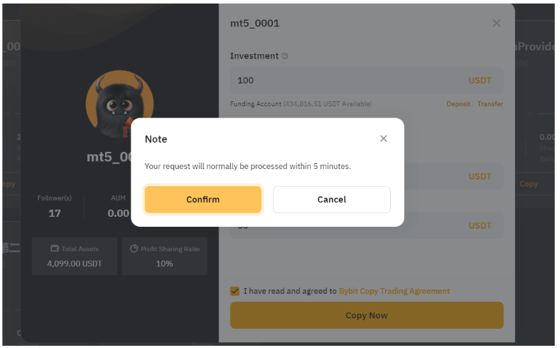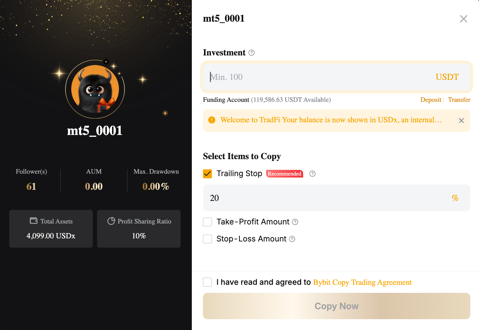 Investment: The minimum and maximum investment amounts are 100 USDx and 1,000,000 USDx respectively for Followers. Please note that your Master Trader can set a higher minimum investment amount required for copying, and you will be able to see the amount stated in the column.