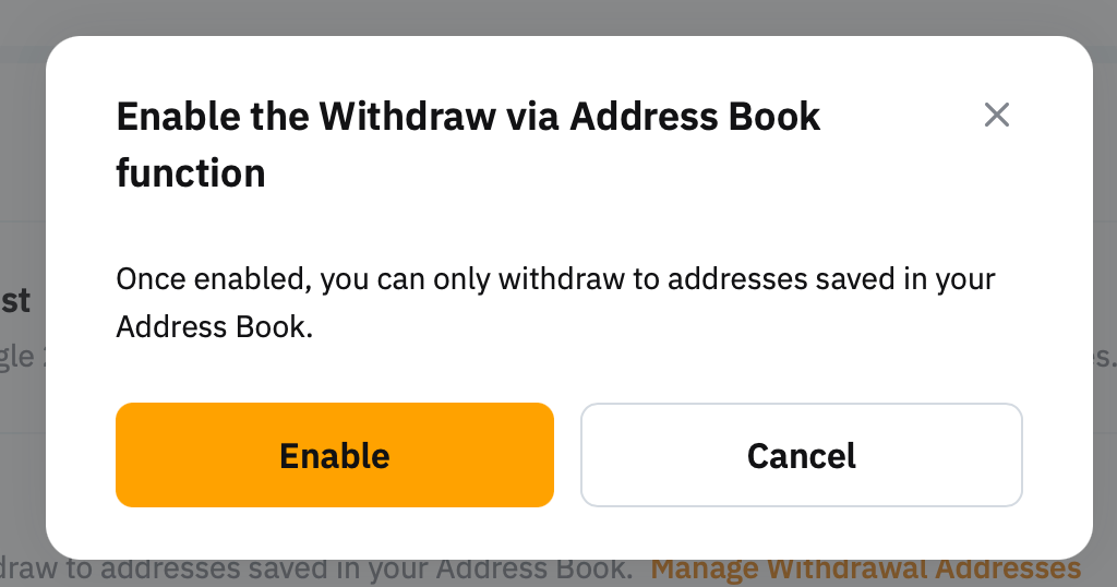 Step 2: A pop-up window will open for you to confirm that you want to enable the Withdraw via Address Book function. Click on Confirm.