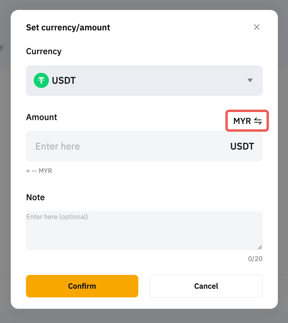 Before sharing the QR code, you have the option to set the type of cryptocurrency, and the amount, and include a note. Additionally, you can click on the Swap icon to enter the amount of fiat currency and the automatically calculated equivalent crypto amount will be shown.