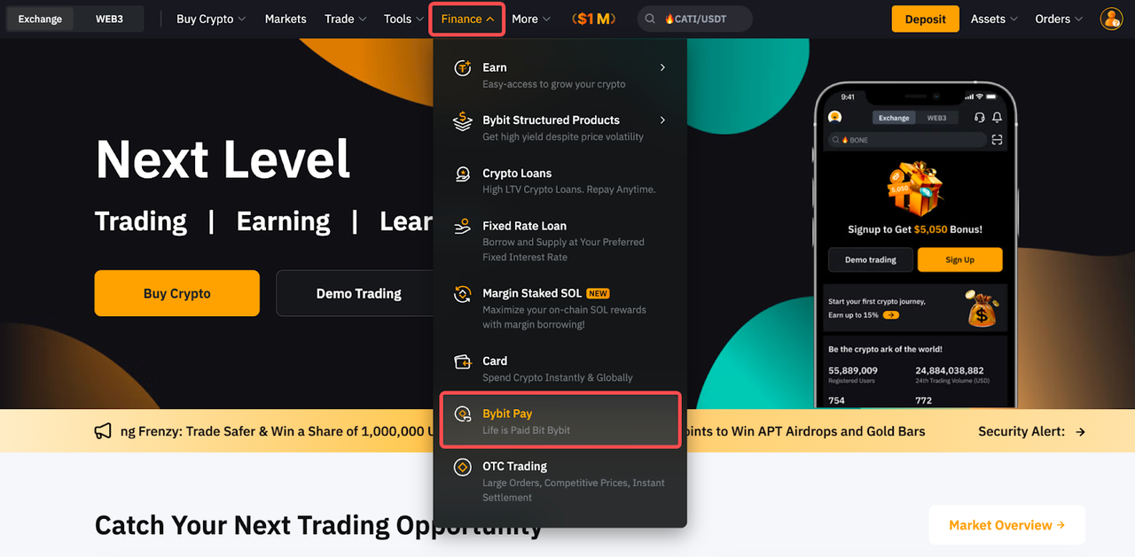 Step 1: From the Bybit homepage, click on Finance → Bybit Pay at the navigation bar to enter the Bybit Pay page. Then, click on the Receive button.