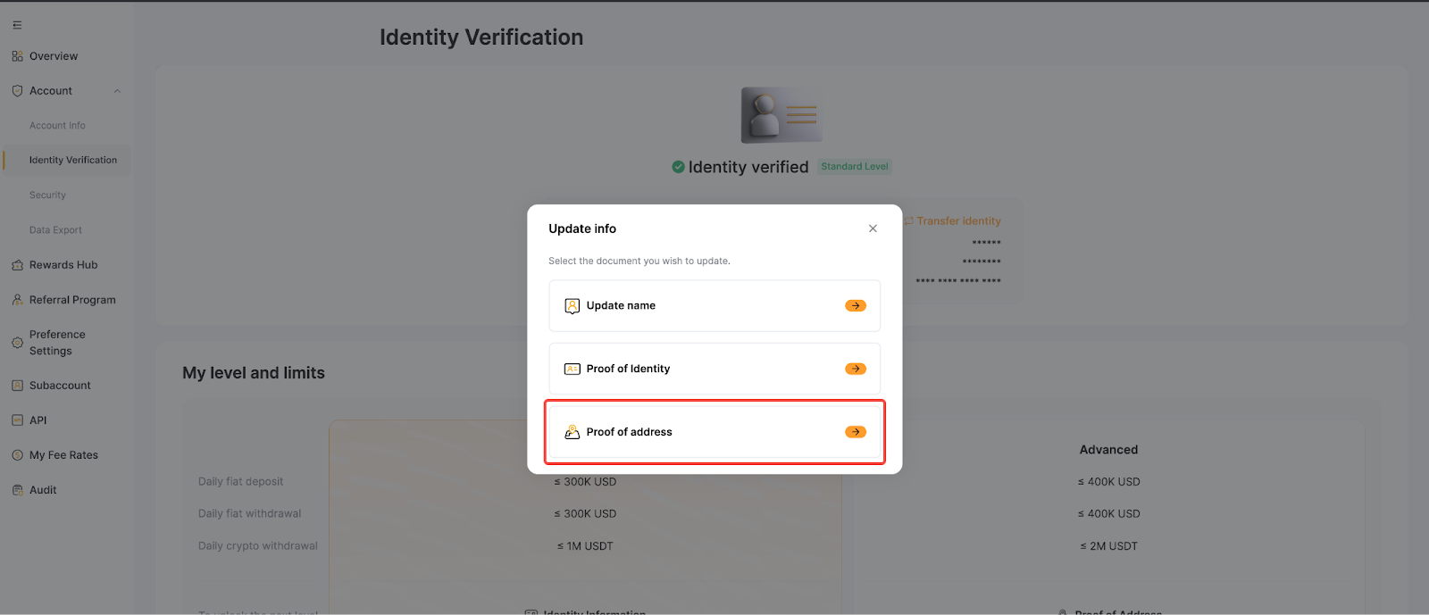 - You can only update your Proof of Address after completing your Advanced Verification.