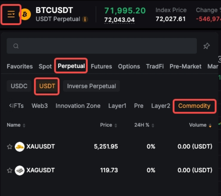 On the Futures trading page, open the symbol dropdown menu in the top-left corner and navigate to Perpetual → USDT → Commodity.