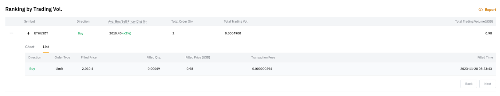 In the List tab, you can access all trades associated with the position. This tab exclusively displays fully closed positions. For order details related to partially closed positions, you can refer to Details of Closed Orders under Trading Performance.